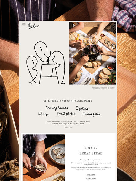 Our identity captures the energy, warmth and spontaneity of meeting friends and sharing great food and wine. A welcoming and characterful logo lockup is made up of a wordmark paired with an energetic illustration that describes the scene within, crafted from the letter forms of 'OY BAR'. Intimate photographs shot with hard flash bring an immediacy to the brand, you feel like you are part of the experience, right there amongst the bustle and laughter of a great night out. The typography on menu flows like conversation and the overall feel is inviting, generous and warm. A relaxed bar for all.